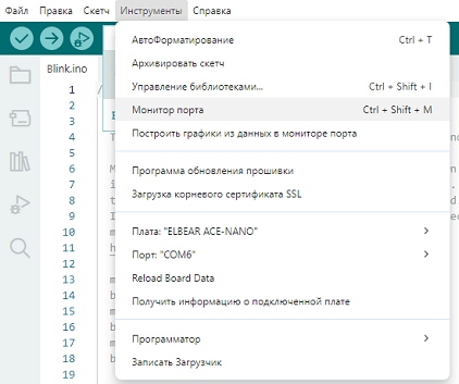 - При необходимости можно открыть терминал и получать сообщения от платы по интерфейсу Serial. Для этого добавьте в скетч работу с интерфейсом и после загрузки прошивки выберите