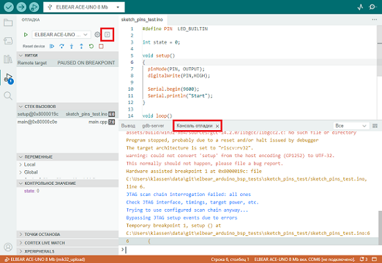 Начиная с версии пакета 0.5.0 для всех плат, входящих в состав пакета, доступен режим отладки скетчей.