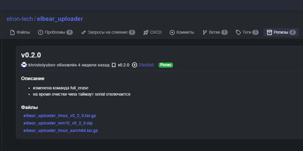 1. ачать последнюю актуальную версию загрузчика для нужной операционной системы из https://gitflic.ru/project/elron-tech/elbear_uploader/release