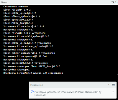 MIK32 Boards (Arduino BSP by Elron), выберите нужную версию пакета и нажмите кнопкуУстановить.