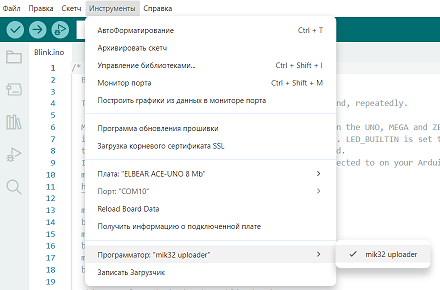 Инструменты -> Программатор -> mik32 uploader. - Проверьте скетч, нажав соответствующую кнопку.