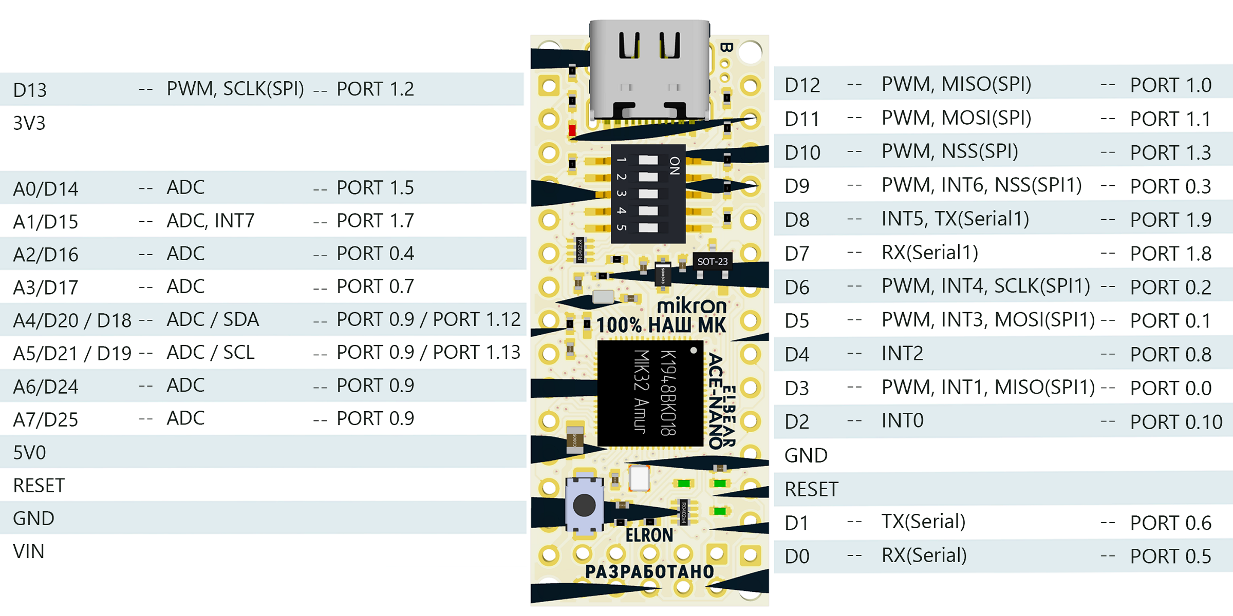 На плате ELBEAR ACE-NANO доступно 8 выводов для формирования ШИМ-сигнала: D3, D5, D6, D9...D13. Генерация сигнала осуществляется с помощью 32-битного таймера. Выводы D3, D5, D6, D9 подключены к таймеру 1, выводы D10...D13 подключены к таймеру 2. Выводы, подключенные к одному и тому же таймеру, выдают ШИМ-сигнал одинаковой частоты.